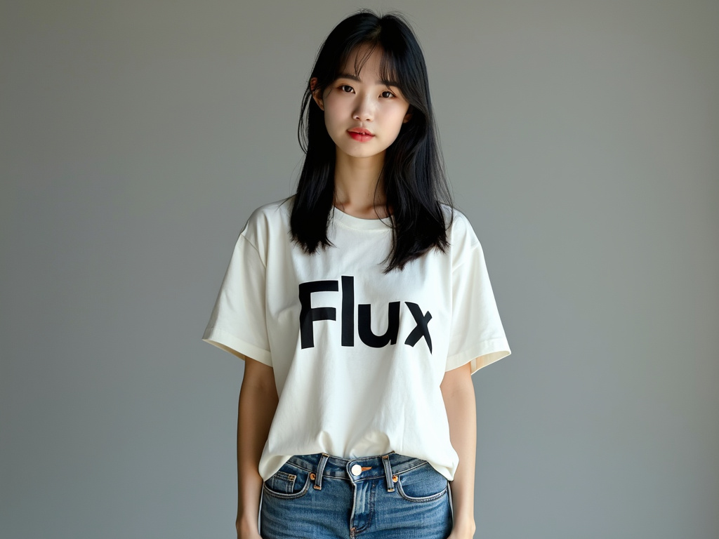 以下の画像は、プロンプトで「Fluxと書かれたTシャツを着ている」ことを命令したものです。