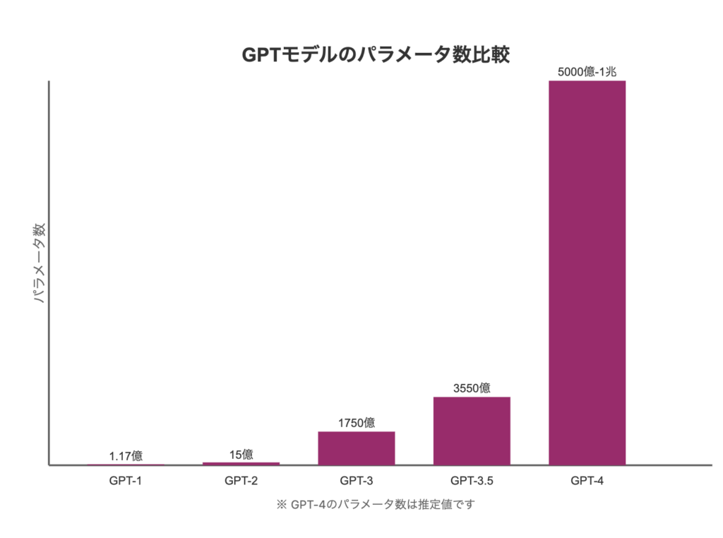 とくに顕著な例として、OpenAIが開発したGPTモデルの進化が挙げられます。2018年に登場したGPT-1から現在のGPT-4までの間に、モデルが扱うデータ量(パラメータ数)は5〜6年で約6000倍に増加しました。この膨大なデータ量の増加は、GPTの理解力と生成能力を劇的に向上させています。