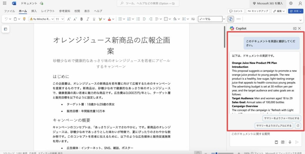 Copilotは多言語に対応しているため、翻訳タスクも処理できます。今回は、以下のプロンプトで資料を英訳してみましょう。