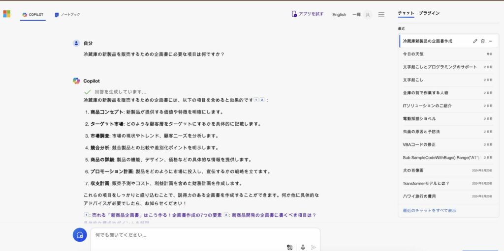 Copilotを活用すると、商品やサービスの企画書作成が可能です。
