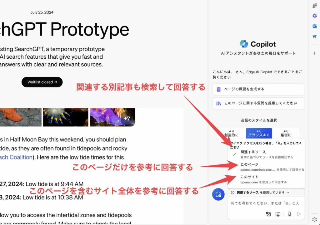 さらに、Copilotはそのページだけでなく、他のWebサイトからも情報を取得できます。そして、その検索範囲はユーザーが以下のように指定できます。