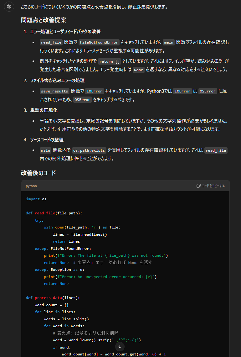 エンジニアが期待する動作と実際の動作の差異を説明すると、ChatGPTは潜在的な問題箇所を指摘し、修正案を提示できます。