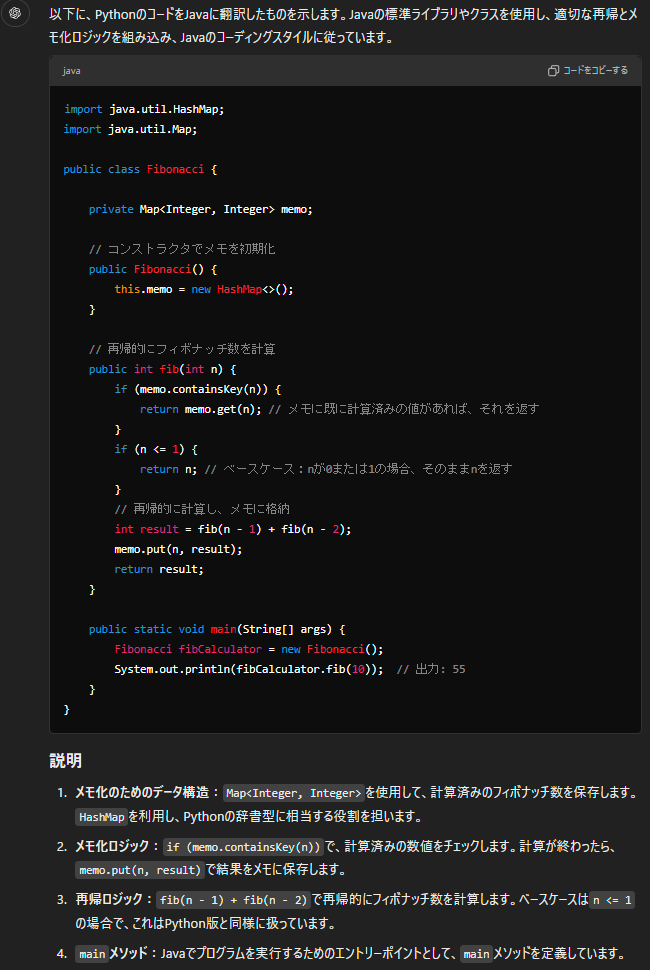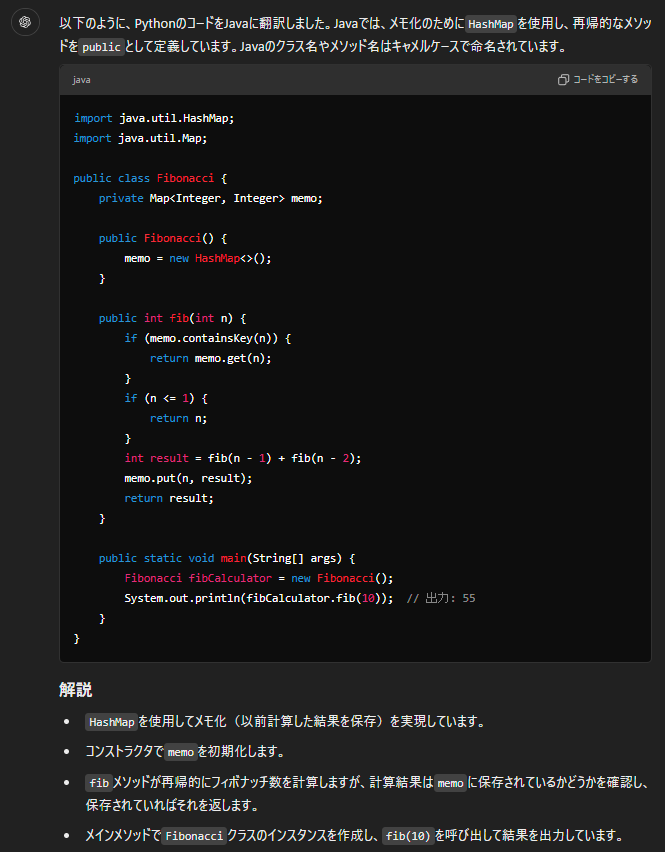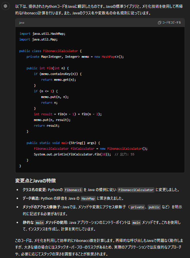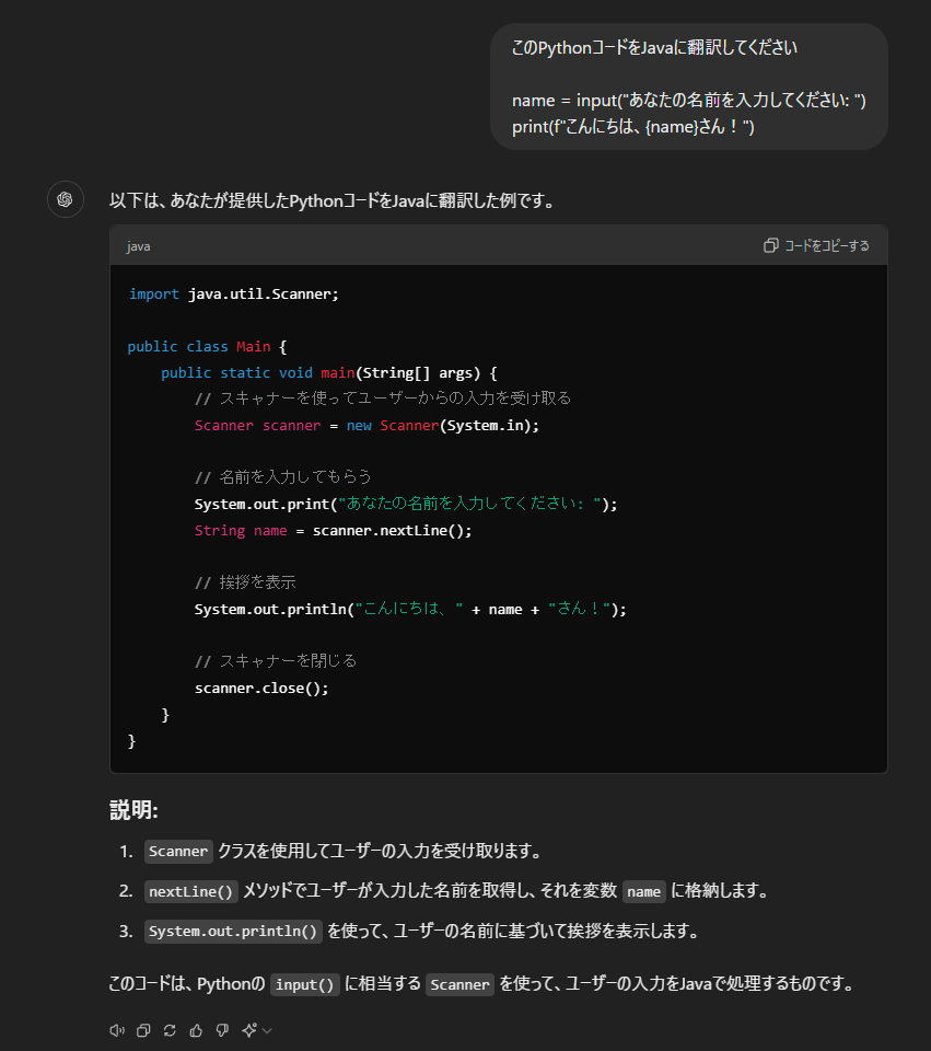 例えば、「このPythonコードをJavaに翻訳してください」という要求に対して、ChatGPTは元のコードの機能を維持しつつ、Javaに翻訳してくれます。