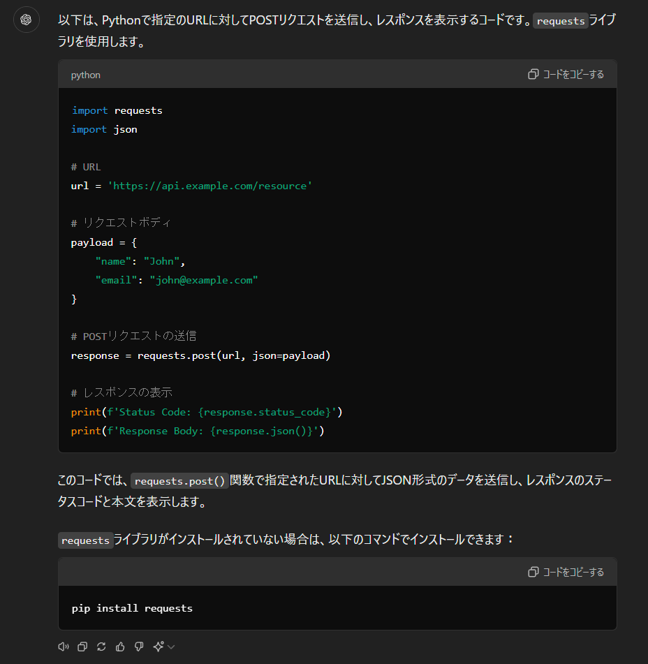 例えば、「Pythonで二分探索アルゴリズムを実装してください」という要求に対して、ChatGPTは以下のように適切なコードを提案できます。