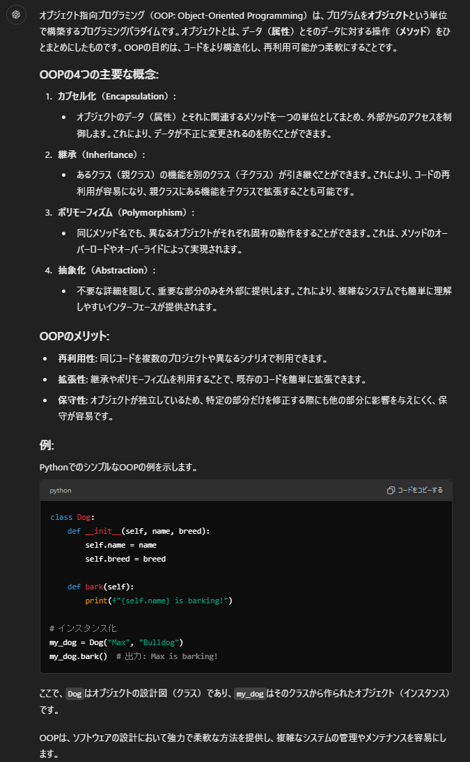 例えば、「オブジェクト指向プログラミングとは何ですか?」という質問に対して、ChatGPTは基本的な概念説明から実際のコード例まで、段階的な解説を提供します。
