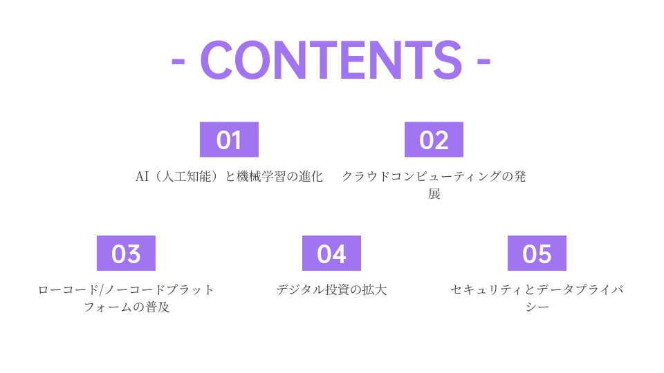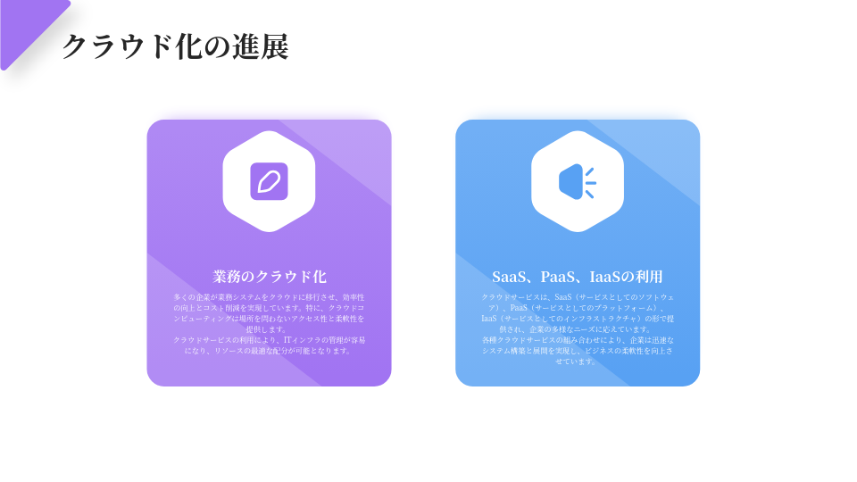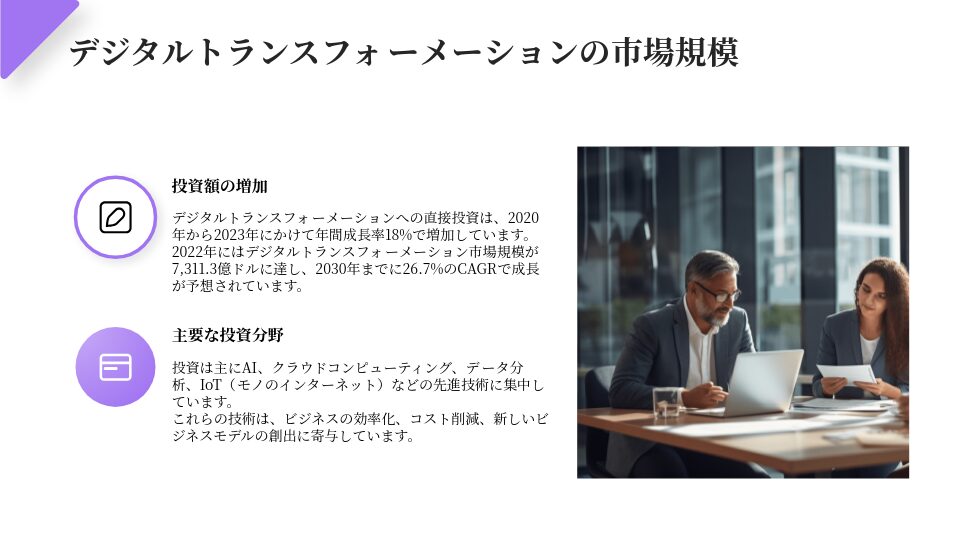 たとえば以下のように、「デジタルトランスフォーメーションの最新トレンド」を検索すると、主要なトレンド、関連する統計データ、具体的な事例研究を含む20〜30枚程度のスライドが自動的に生成されます。