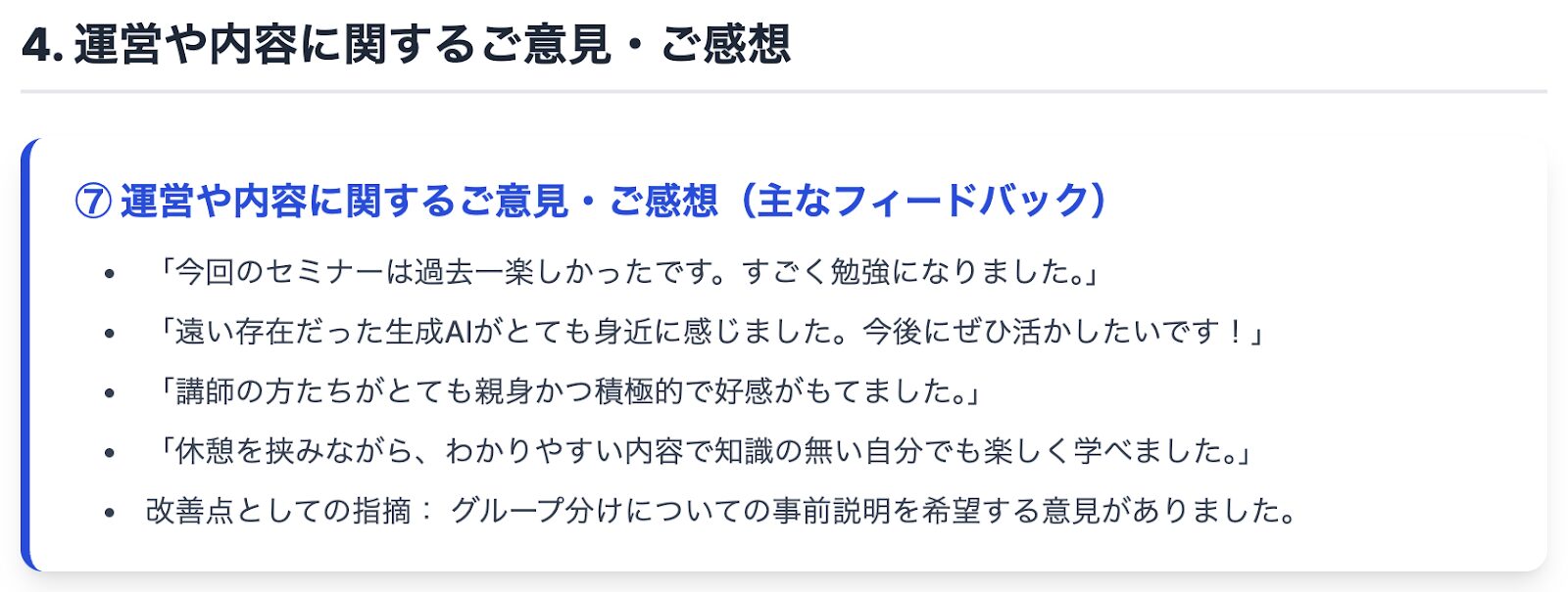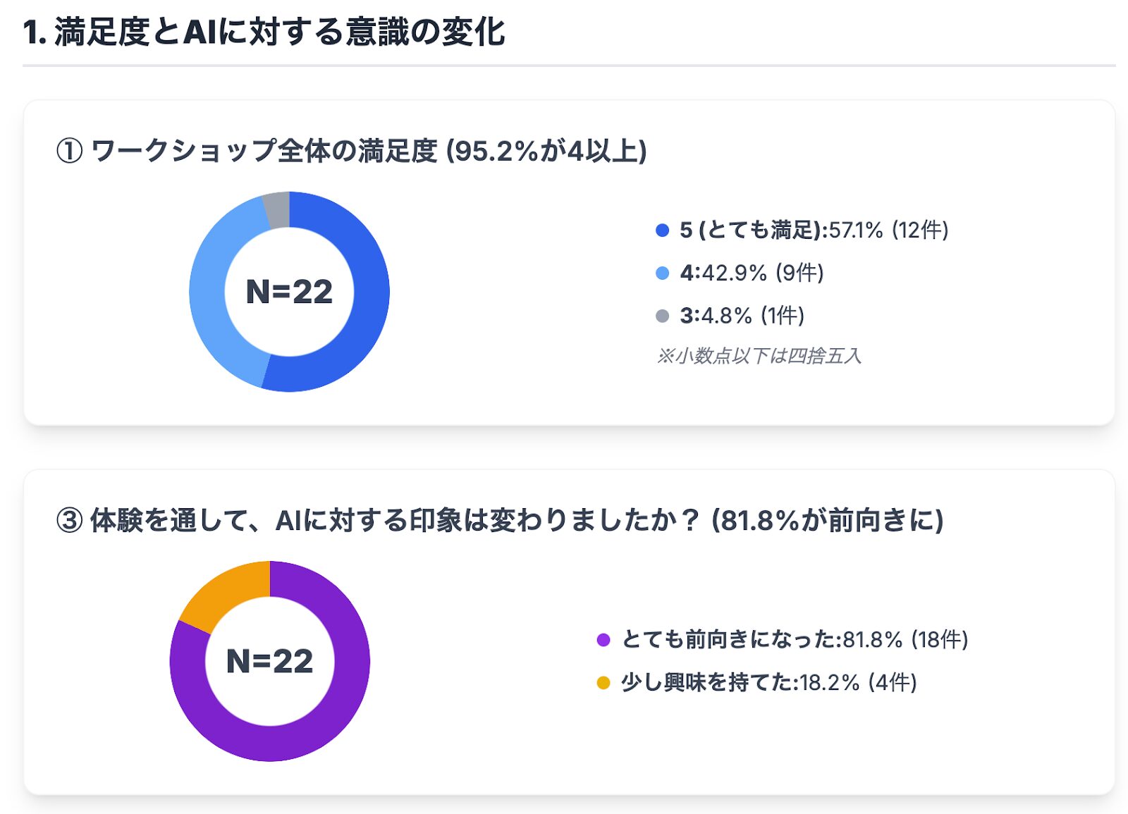 アンケートでは、全体の95.2%が「満足(4以上)」と回答。さらに、81.8%が「AIに対して前向きになった」と答えました。