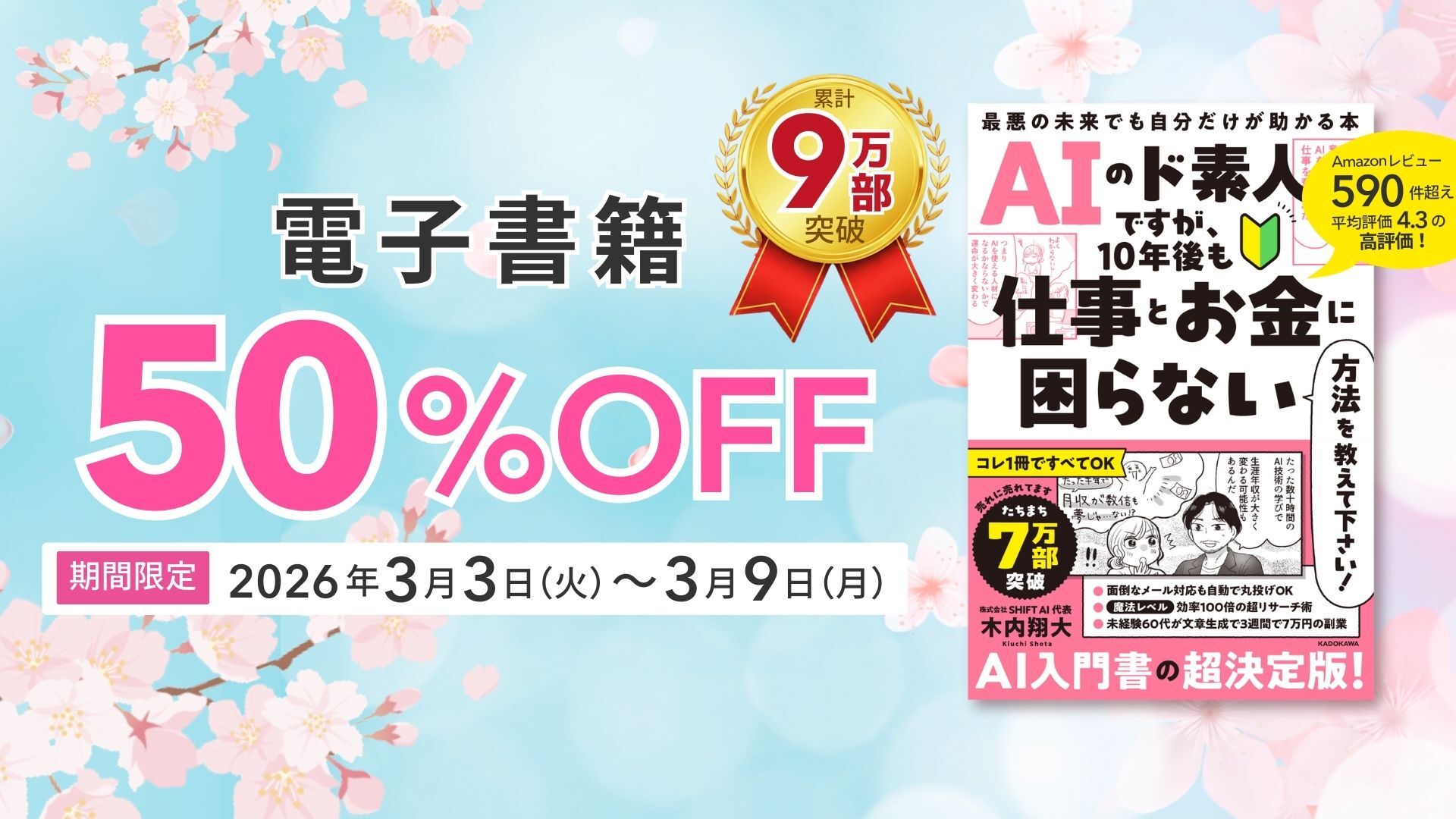 生成AIを学びたいなら「とりあえずコレ」の名著『AIのド素人ですが、10年後も仕事とお金に困らない方法を教えて下さい!』は6万部(9月末時点)を突破!初心者から上級者まで、必読の一冊です!