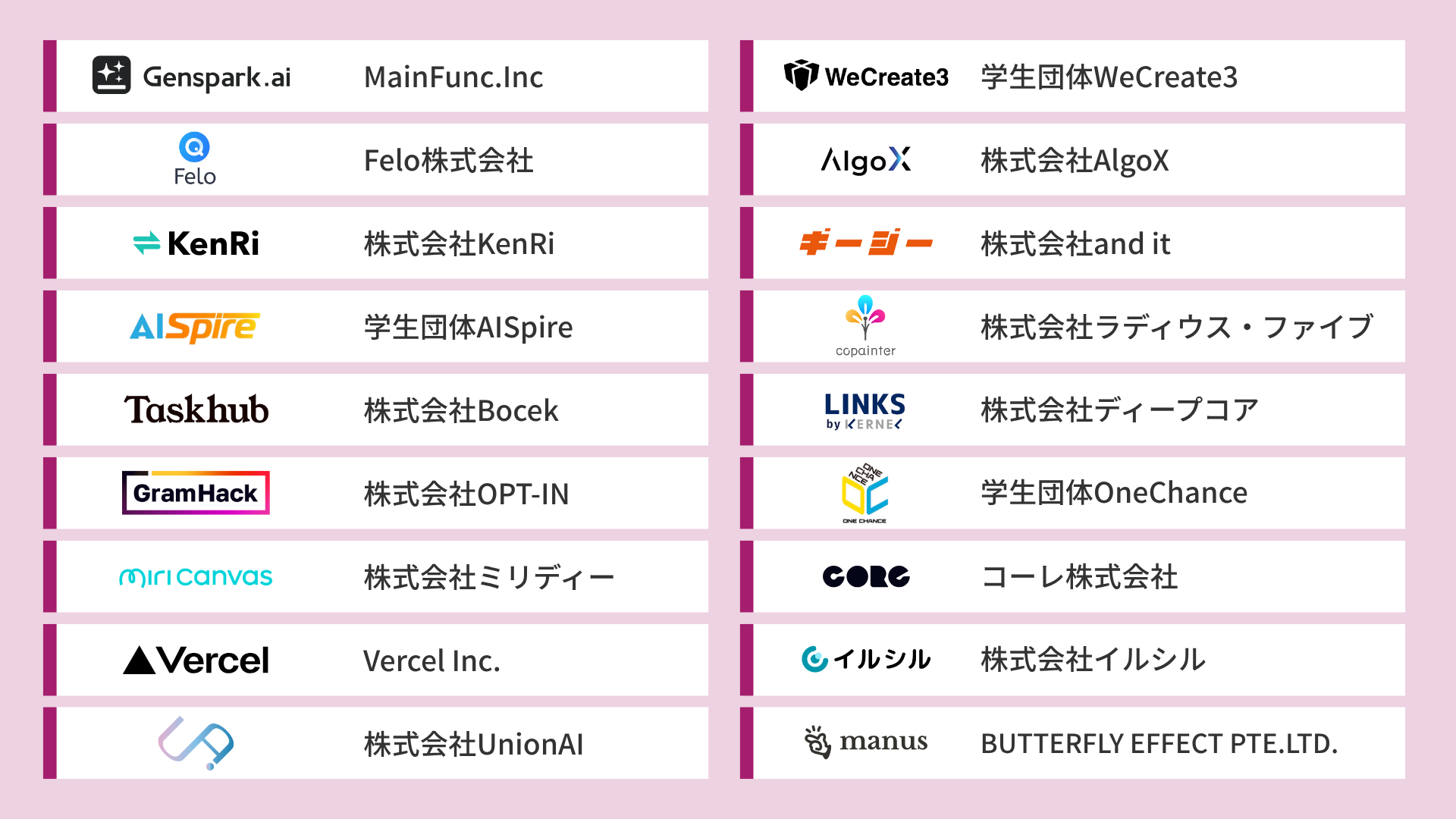 今回のイベントは出展企業も豪華なんです!Butterfly Effect PTE. LTD.社様、Vercel社様やMainFunc社様などこれからのAI時代の先を行く、先進的な企業が合計18社出展!AIのイベントとしては最大規模の出展数となっています。