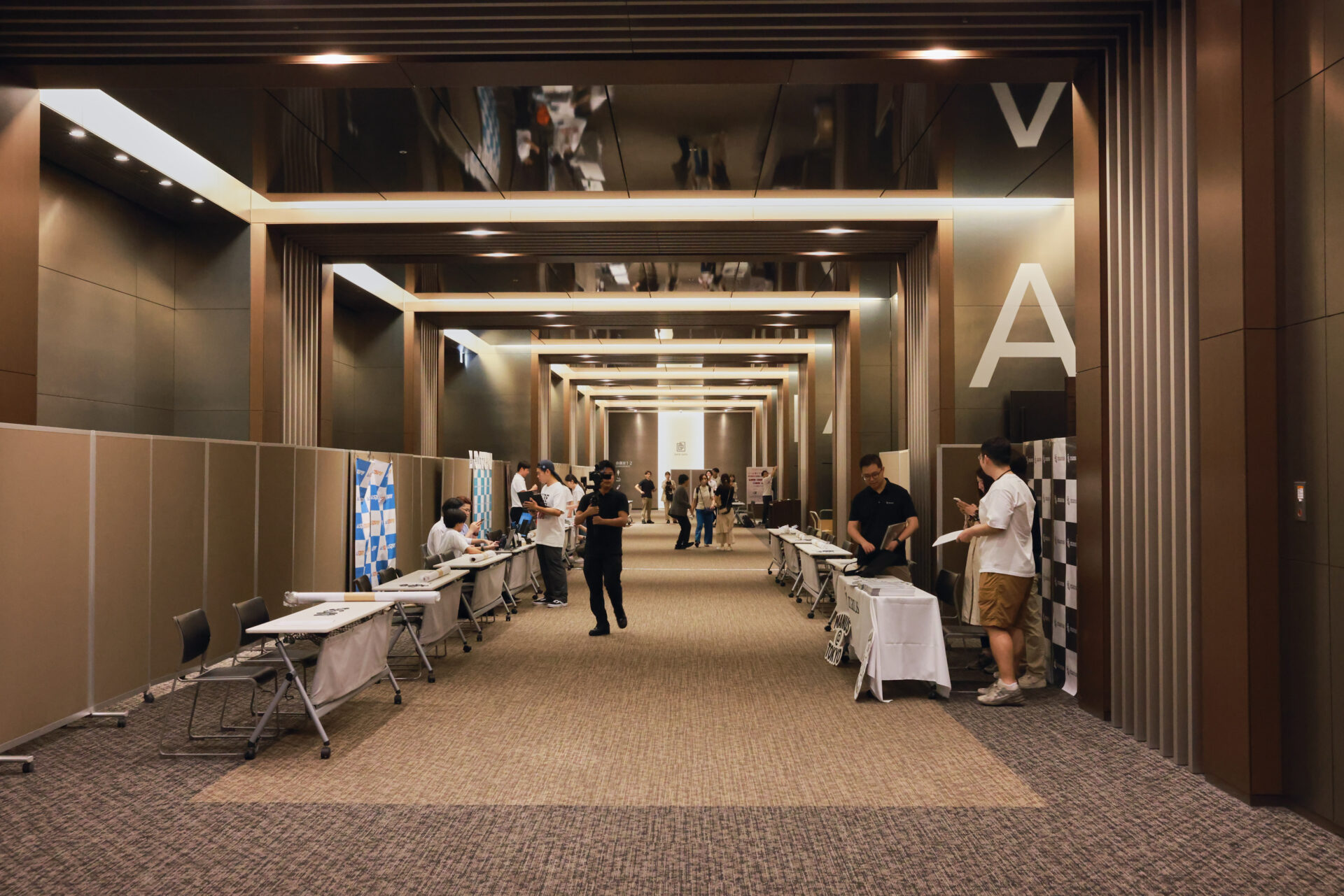 各企業の担当者の皆さんも早朝から会場入りして、自社ブースの設営に取り組んでいました。最新のAI技術やサービスを参加者の皆さんに分かりやすく伝えるため、デモ画面の調整やパンフレットの配置まで、細かな準備が続きます。