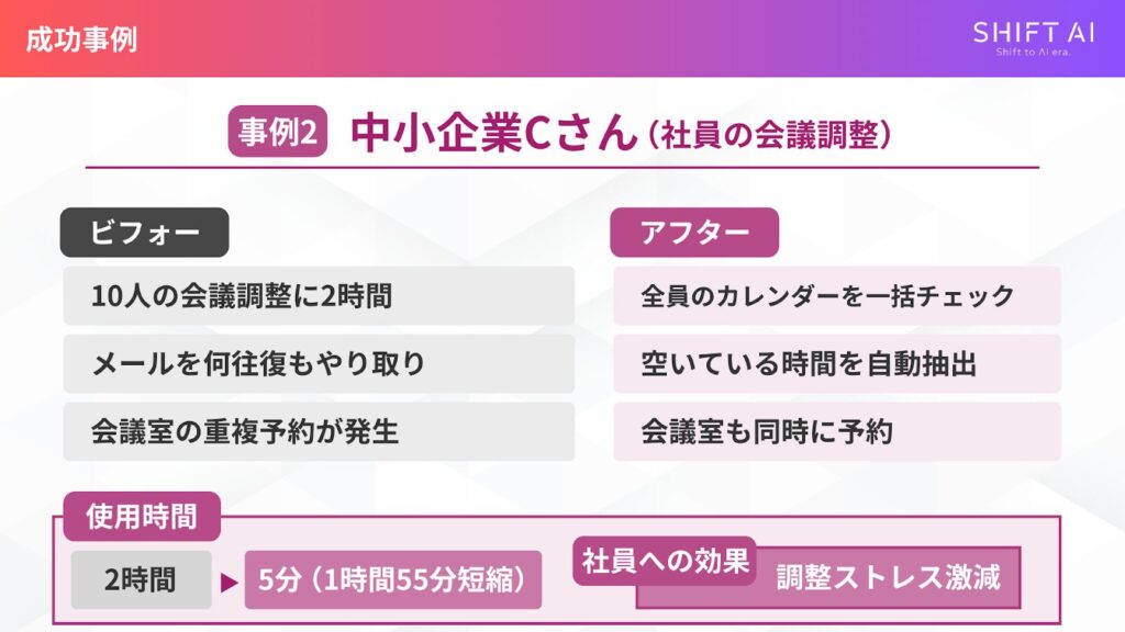 10人の会議調整を2時間から5分へ、また毎月の請求書作成を4時間から30分へと改善した事例が紹介されました。