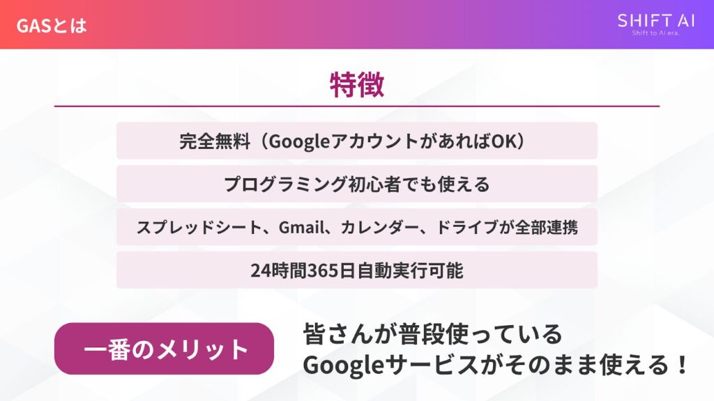 スプレッドシート、Gmail、カレンダー、ドライブなど、普段使いのツールをそのまま自動化できる点がGASの最大の強みです。