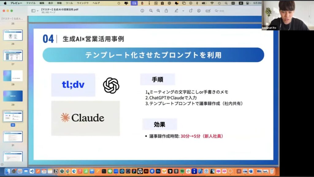 ウェビナーでは、営業活動のさまざまな場面で生成AIを使って業務を効率化する方法が紹介されました。